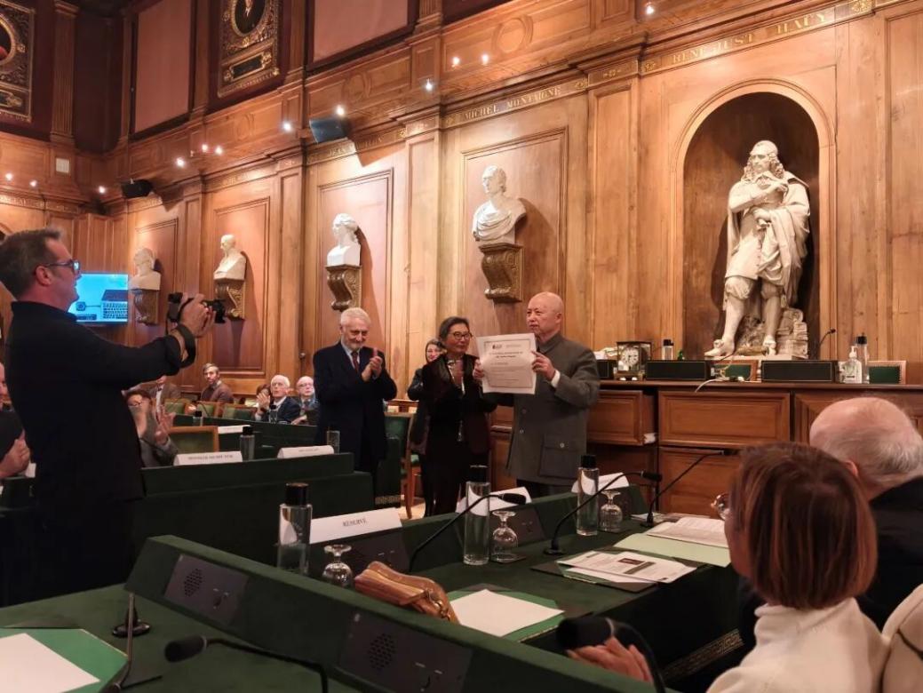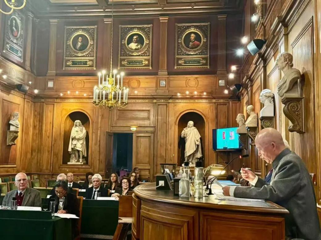 2025年10月24日晚,法兰西金石与美文学院在历史悠久、富丽堂皇的法兰西学院会议厅举行隆重的颁奖典礼,将“汪德迈中国学奖”(Le prix d’études chinoises en l’honneur de Léon Vandermeersch)授予北京师范大学跨文化研究院专家委员会主任、中国文化书院跨文化研究分院学术委员会主任、北京大学东方文学研究中心王邦维教授。金石与美文学院(l'Académie des Inscriptions et Belles-Lettres)院长傅飞岚(Franciscus Verellen)先生、终身秘书长尼古拉·格里马尔(Nicolas Grimal)先生、名誉终身秘书长米歇尔·冉克(Michel Zink)先生、法兰西艺术院终身秘书长洛朗·佩蒂吉尔巴尔(Laurent Petitgirard)先生、部分院士、中国驻法使馆文化处官员、法国和中国学者出席典礼。典礼上终身秘书长尼古拉·格里马尔先生宣读授予王邦维教授的决定并详细介绍王邦维个人的学术经历。王邦维教授在致谢发言中感谢法兰西学院授予其汪德迈中国学奖,回顾其学术研究受导师季羡林先生的指导,亦得益于同安德烈·巴罗(AndréBareau)、汪德迈(Léon Vandermeersch)等学者的交流,深受沙畹(Éd.Chavannes)、伯希和(Paul Pelliot)、列维(Sylvain Lévi)等法国学者著作的启发。