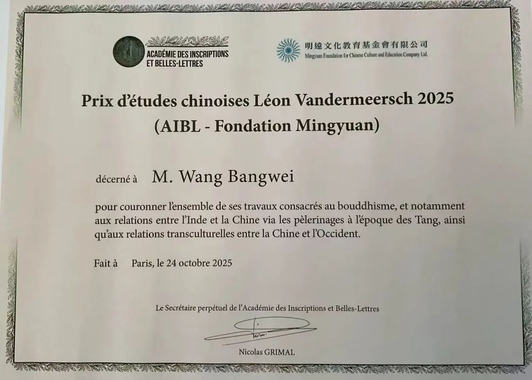 法兰西学院创立于1795年,法兰西金石与美文学院是法兰西学院的五个分支学院之一,其设立的学术奖项在世界范围授予国际知名的科学家、人文学者与艺术家,具有很高的学术影响力。“汪德迈中国学奖”由法兰西金石与美文学院设立,香港明远基金会资助,旨在纪念法国著名汉学家汪德迈(Léon Vandermeersch,1928-2021)生前的杰出贡献,系国际汉学界最高荣誉之一。4月25日,经法兰西金石与美文学院的评审委员会讨论和投票,决定将2025年度“汪德迈中国学奖”授予王邦维教授,表彰其在佛教学研究领域的卓越贡献,特别是在以唐代赴印求法僧为重要内容的中印文化交流与中外跨文化关系研究方面取得的突出成就。